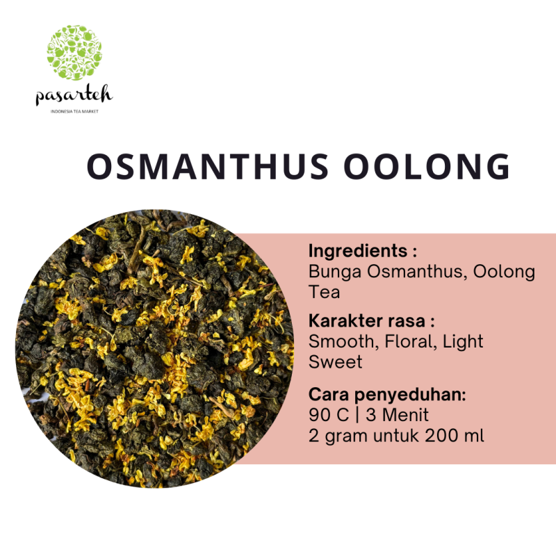 Pasar Teh Osmanthus Oolong Tea adalah teh oolong berkualitas dengan aroma osmanthus yang elegan dan natural. Memiliki karakter rasa smooth, floral, lightly sweet, dengan body ringan dan clean finish yang menenangkan.